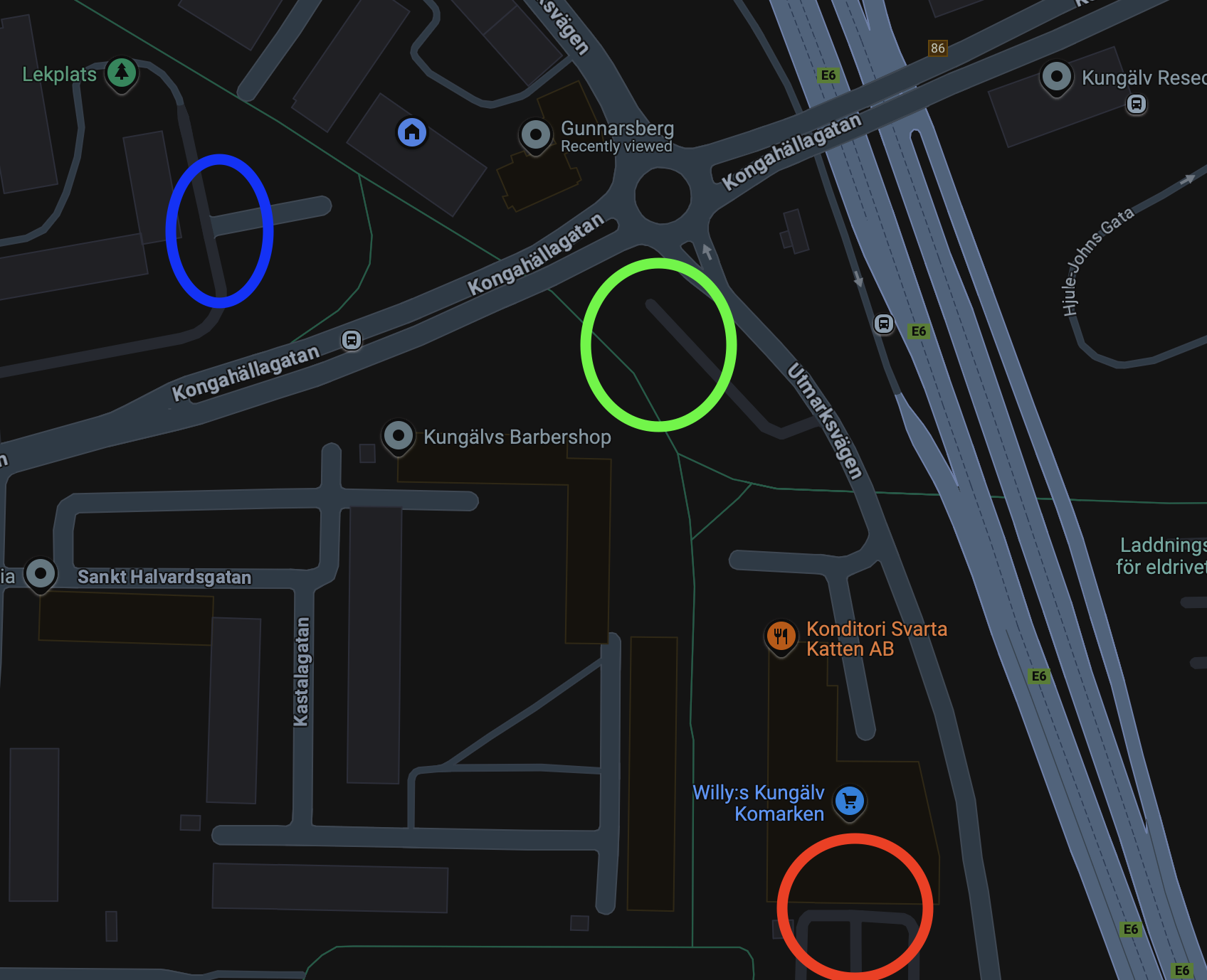 Finns 3 parkeringsplatser markerade vid blått, en större parkeringsplats vid grönt, annars är det borta vid Willys vid rött!